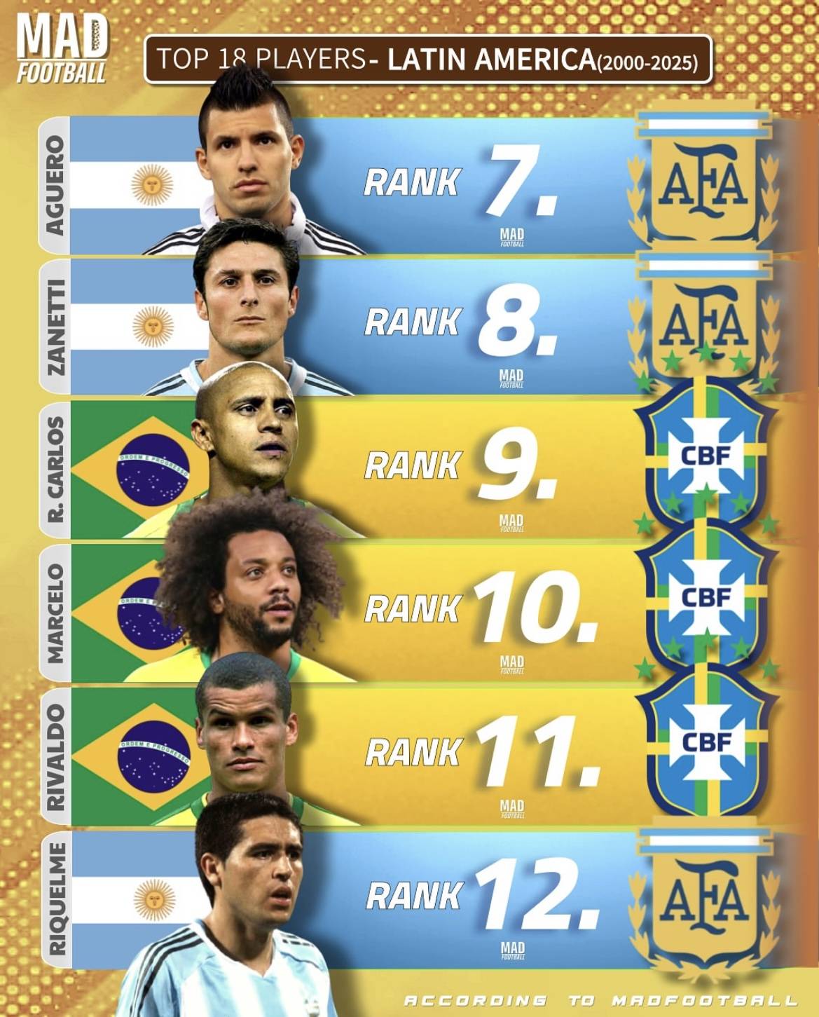 近日,知名足球数据媒体 MAD FOOTBALL 公布了一份极具分量的榜单——《2000—2025 年拉丁美洲最佳 18 名球员》。这份榜单涵盖了过去 25 年间最具影响力的南美球星,囊括了从梅西到罗纳尔多,从苏亚雷斯到内马尔等众多家喻户晓的名字。一经发布,便迅速在全球球迷圈引发热议,不少人对排名的合理性发表了不同看法,有人认为实至名归,也有人觉得某些球员的入选或排名值得商榷。
